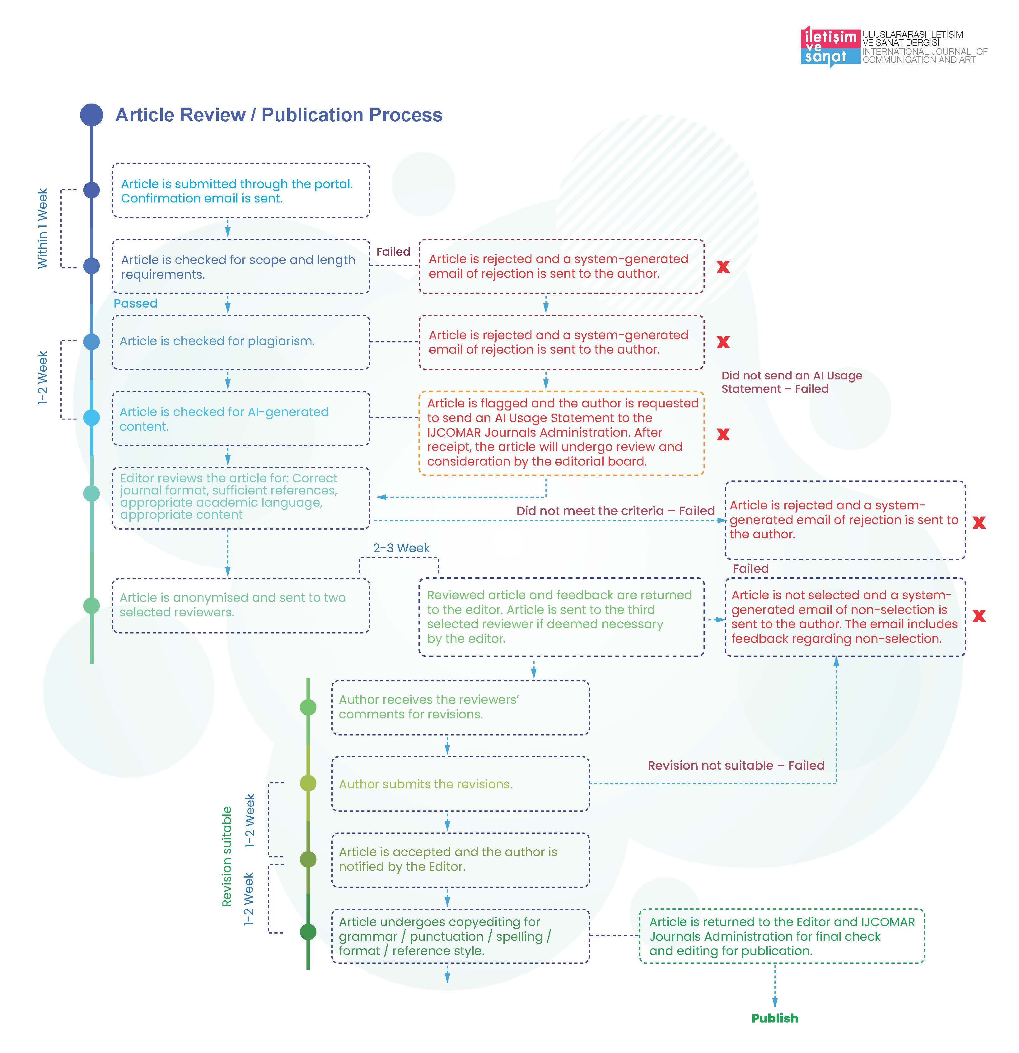 Uluslararası İletişim ve Sanat Dergisi (IJCOMAR)’nde makale değerlendirme ve yayın süreci; akademik kaliteyi, etik uygunluğu ve editoryal şeffaflığı sağlamak amacıyla birden fazla, açık biçimde tanımlanmış aşamadan oluşmaktadır.